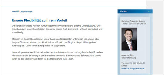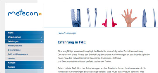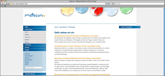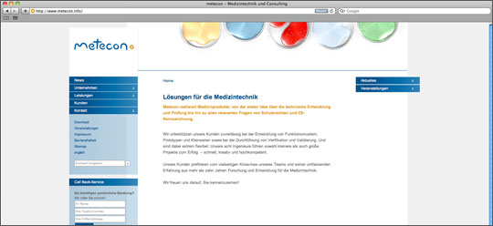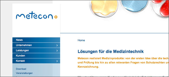 Die Website der metecon GmbH, Entwickler von Medizintechnik, haben wir mit modernen, stilistischen Mitteln umgesetzt, ohne dabei Einbußen hinsichtlich der professionellen und kompetenten Erscheinung, die der Kunde wünschte, hinnehmen zu müssen. → www.metecon.info